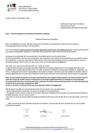 La FSU-SNUipp37 écrit à M le DASEN 37 pour le protocole de gestion des élèves ayant des troubles du comportement et de la conduite soit le garant de notre santé et notre sécurité.